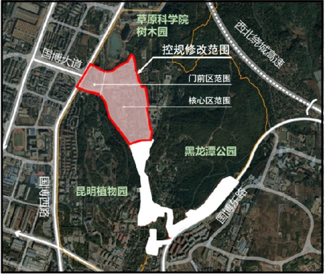 今日,昆明市自然資源和規劃局發布國家植物博物館核心區和門前區的控詳規修改方案批前公示,此次調規重點在于將龍欣路以西的商業和綠化用地規劃為門前區,并將用地全部調整為商業開發,調整后國家