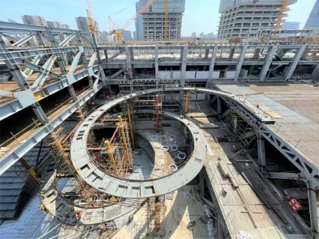 在單體內部,有約200米長的旋轉坡道,重量約為280噸。面板、底板、橫隔板和內隔板密集排列,焊接工作量巨大。在有限施工空間內,建設者們利用高空拼裝施工工藝,以吊索進行出裝預拼,再對吊索分批次分階段預應力張拉,促使旋轉坡道完成最終受力體系轉換,完成拼接。