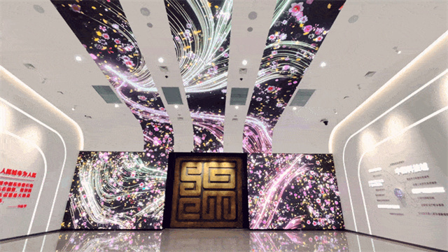 城市標識看似是將顯示屏幕一分為二,但隨著工作人員手指一動,兩側便會緩緩推出兩塊小屏幕,繼而形成一整塊大屏,為參觀者提供了一份絕佳的觀影體驗。