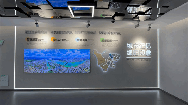 以圖文展板形式對綿陽基本情況進行總體介紹,巧妙利用廊道空間,依次展示綿陽歷史人文、科技創新、產業經濟及生態民生等方面城市發展優勢與近年來的建設成就。
