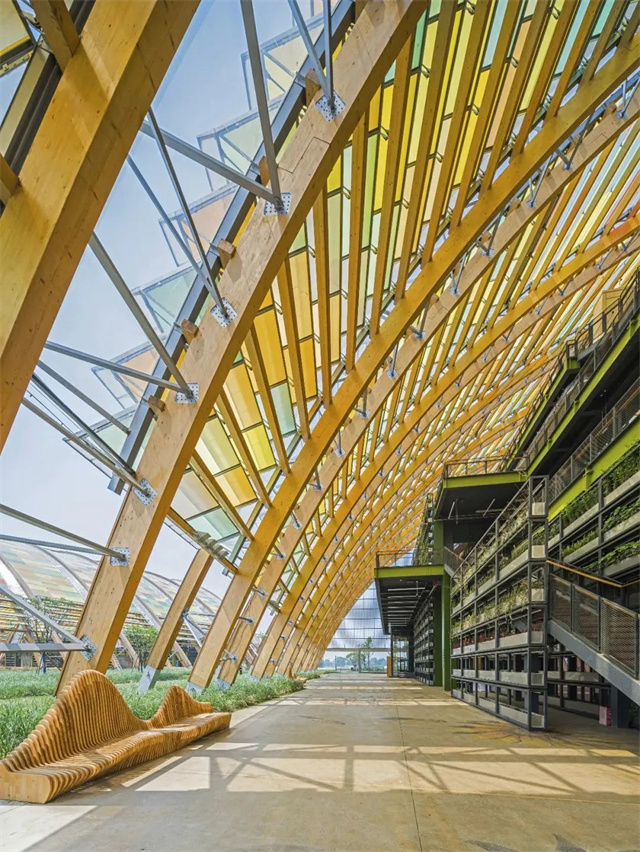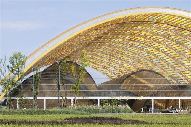 農(nóng)博會主展館由5組巨型木構(gòu)棚撐架,宛若道道飛虹,與廣袤的田野尺度相稱,高低起伏、空透輕巧。指狀開放的布局讓建筑與大田交織相融,室內(nèi)復(fù)合化的會議、會展、商業(yè)、孵化等功能區(qū)給建筑的使用提供了多種可能。
